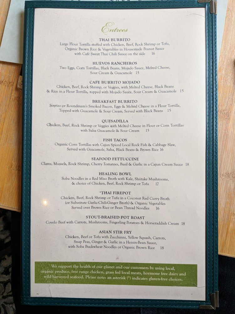 Large flour tortilla stuffed with chicken, beef, shrimp or tofu, organic brown rice, vegetables in housemade peanut sauce with café sweet thai chili sauce on the side